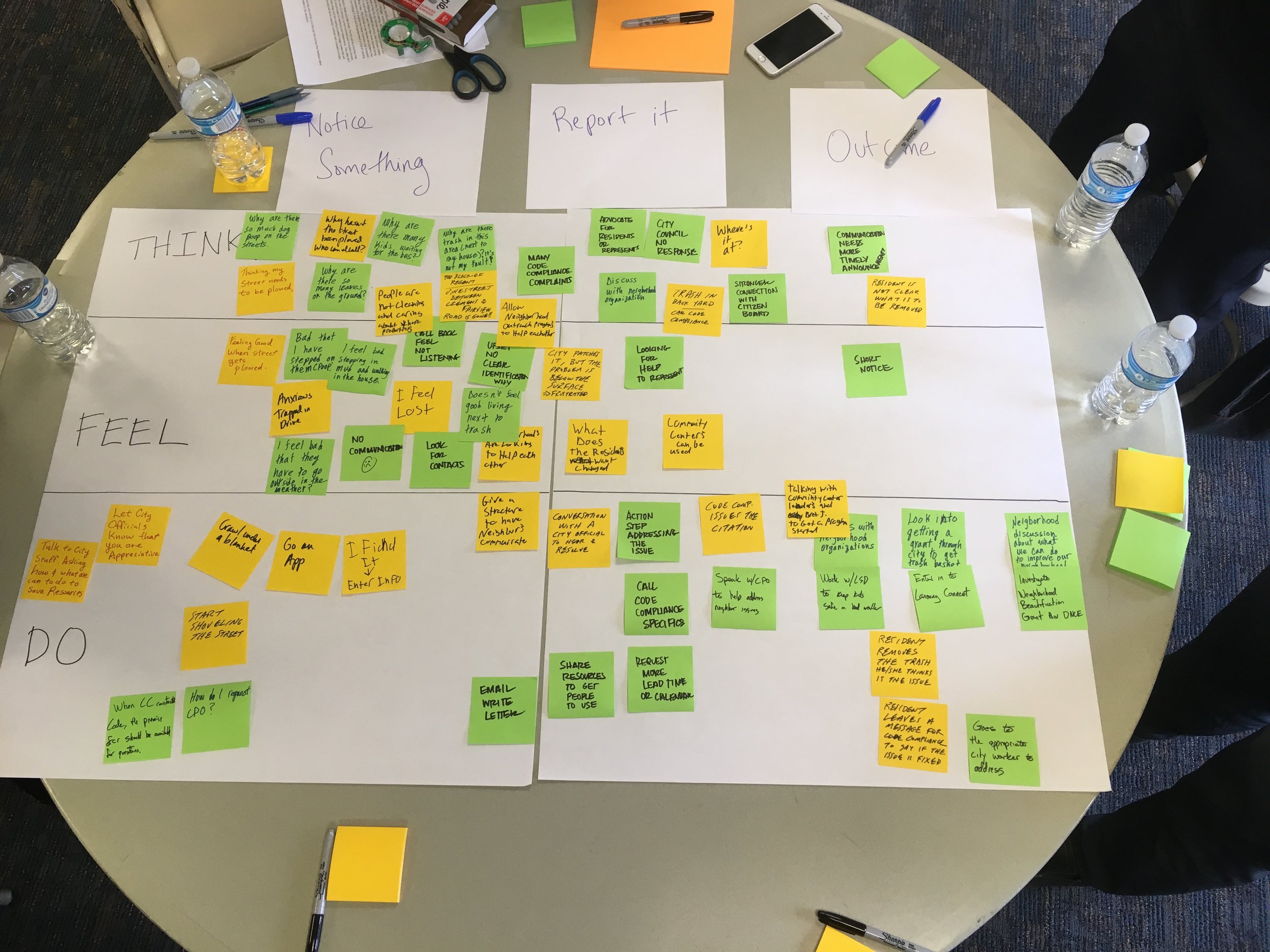 I called a huddle with my teammates mid-PD and suggested that we give the “think, feel, do” activity more structure, creating a journey map. I suggested adding “Notice Something,” “Report It,” and “Resolution.” My teammate countered that some citizens’ issues didn’t get a resolution, how about “Outcome?” He made an excellent point, and that’s what we did.