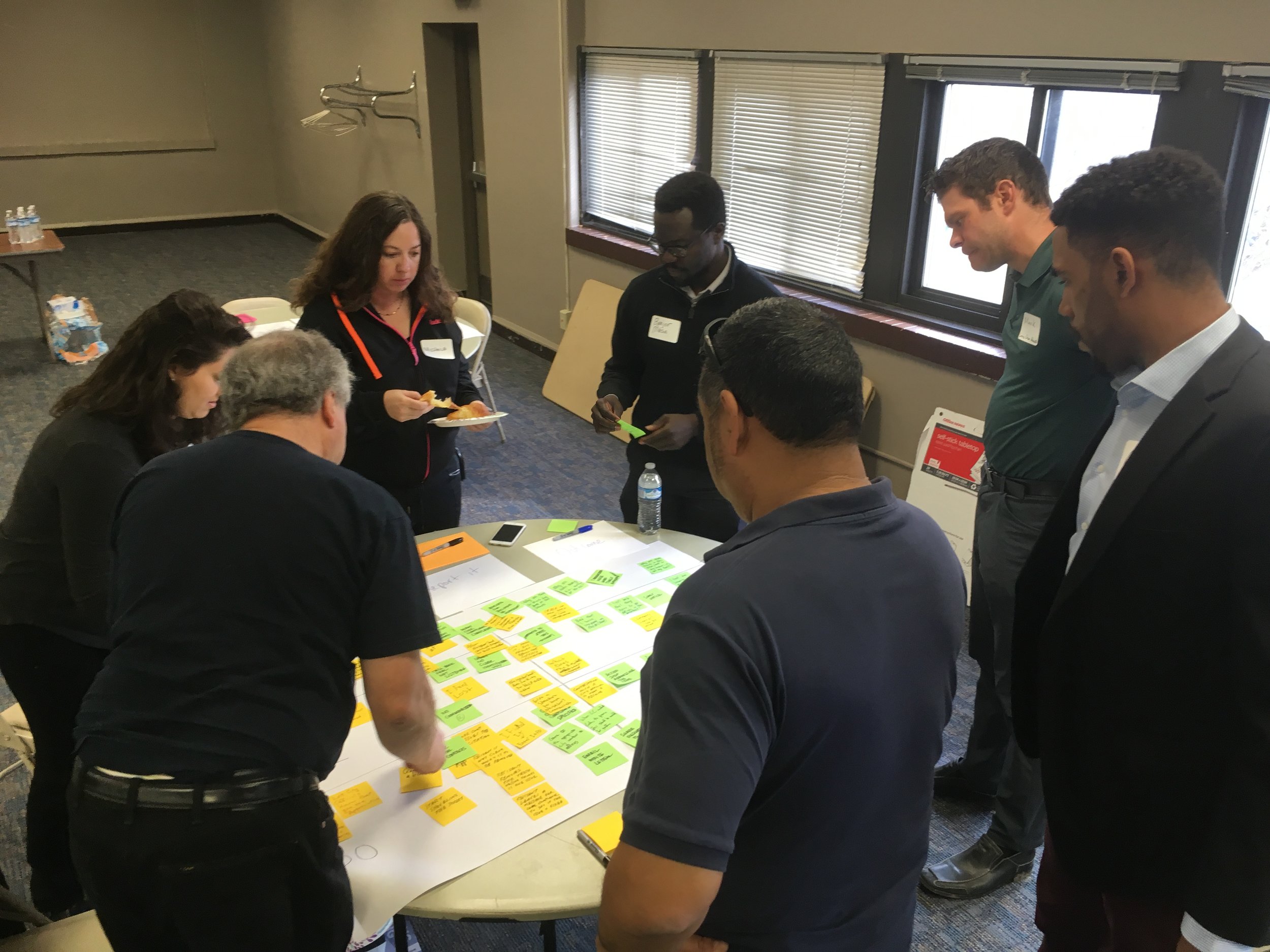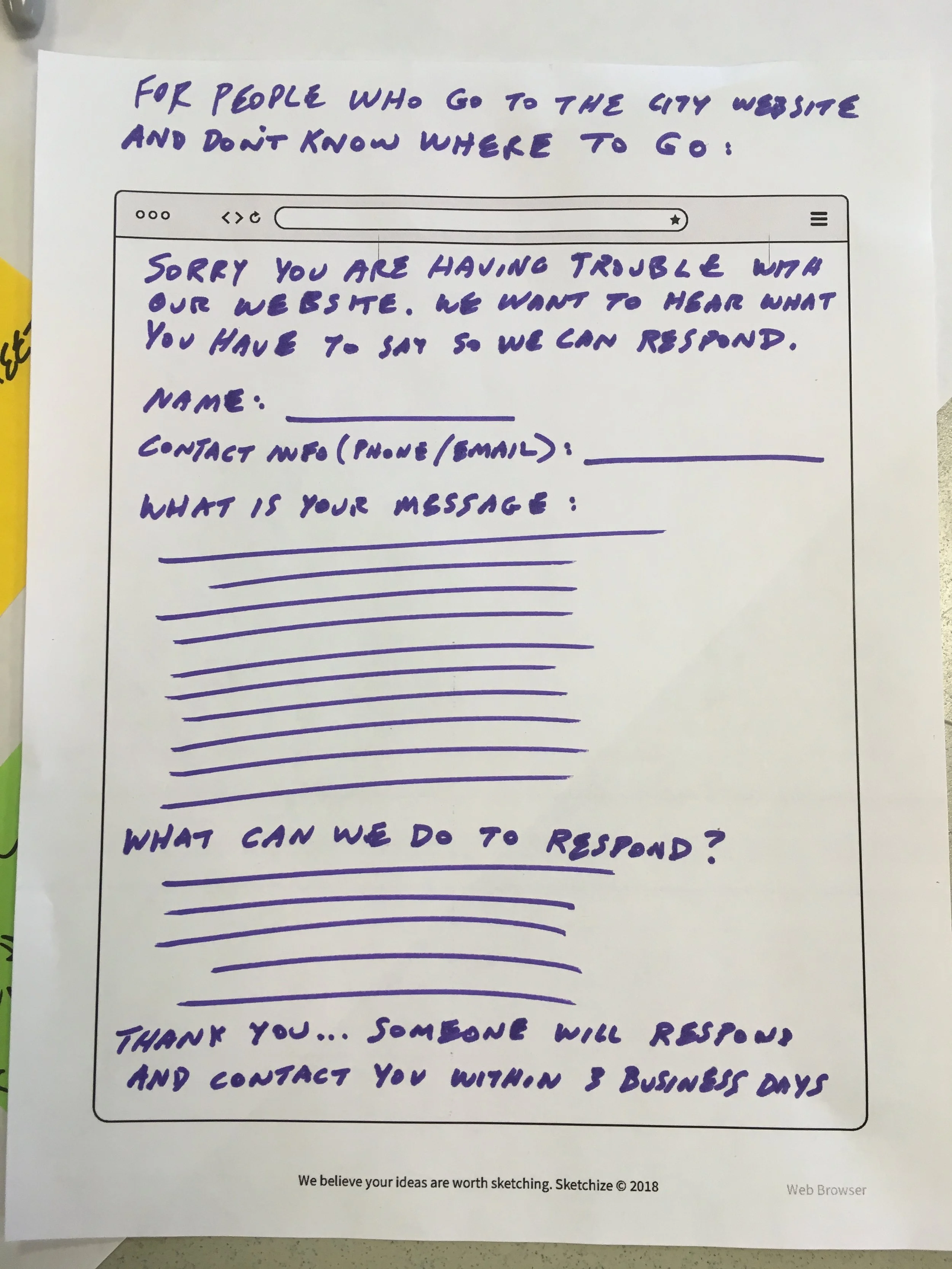 We had a recruiting imbalance with 10 citizens and 2 employees. Having only two government employees present changed the direction of our research. Initially, we’d planned to get an understanding of the whole citizen feedback process from citizens’ reporting concerns, through the government process of routing that concern to the outcome. However, we weren’t able to gather enough information about the internal government process during the PD to create a survey that would address the internal needs of the city workers. We changed our research plan to include a focus group instead of a survey.