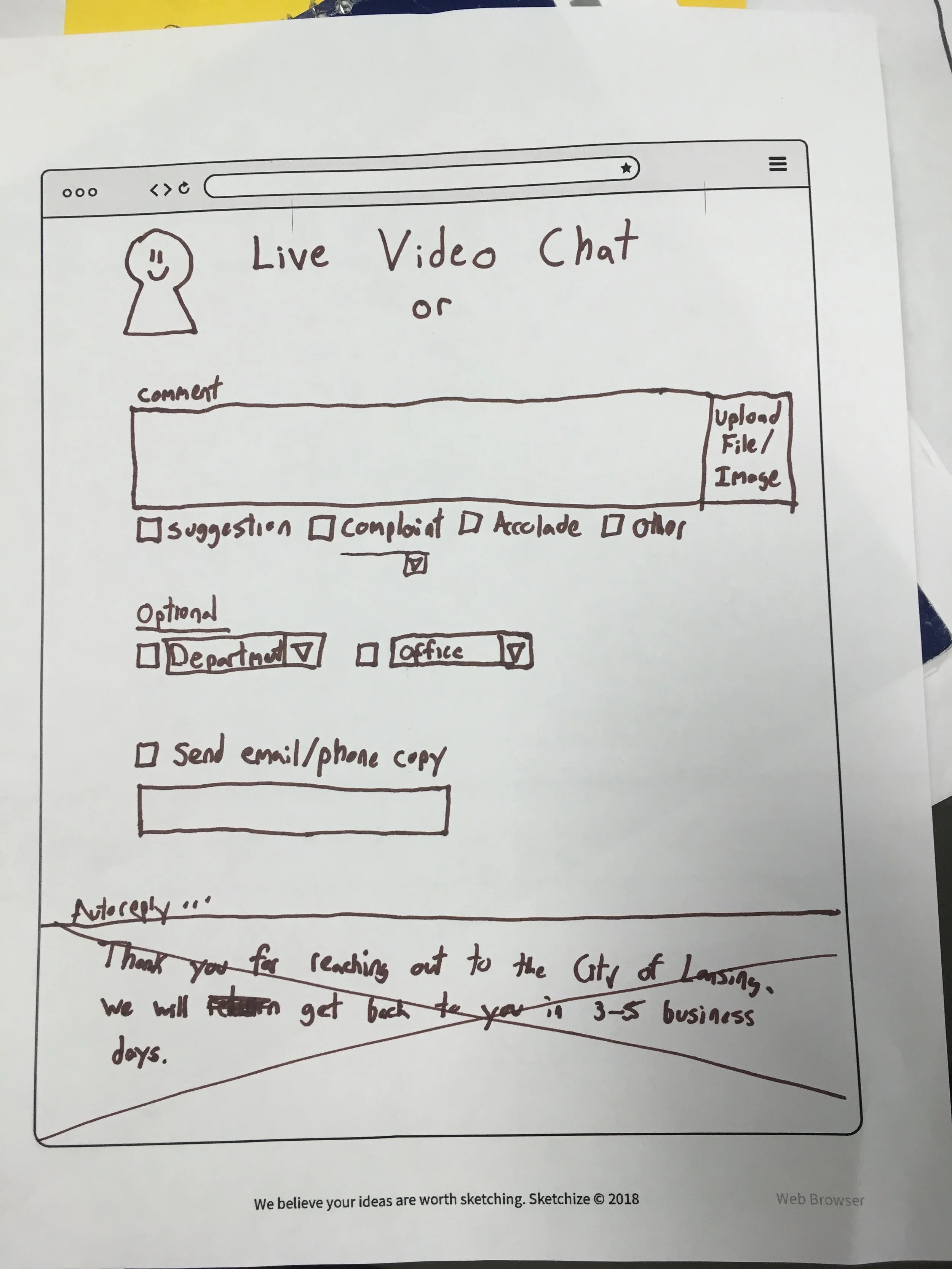 tl;dr: I led a participatory design activity with Lansing residents and city employees and a focus group with city employees in order to understand the flow of citizen feedback through the City of Lansing. After analyzing the data from citizens and city employees, my teammates and I provided recommendations about how to improve the citizen feedback process to the Department of Neighborhoods + Citizen Engagement of the City of Lansing.
