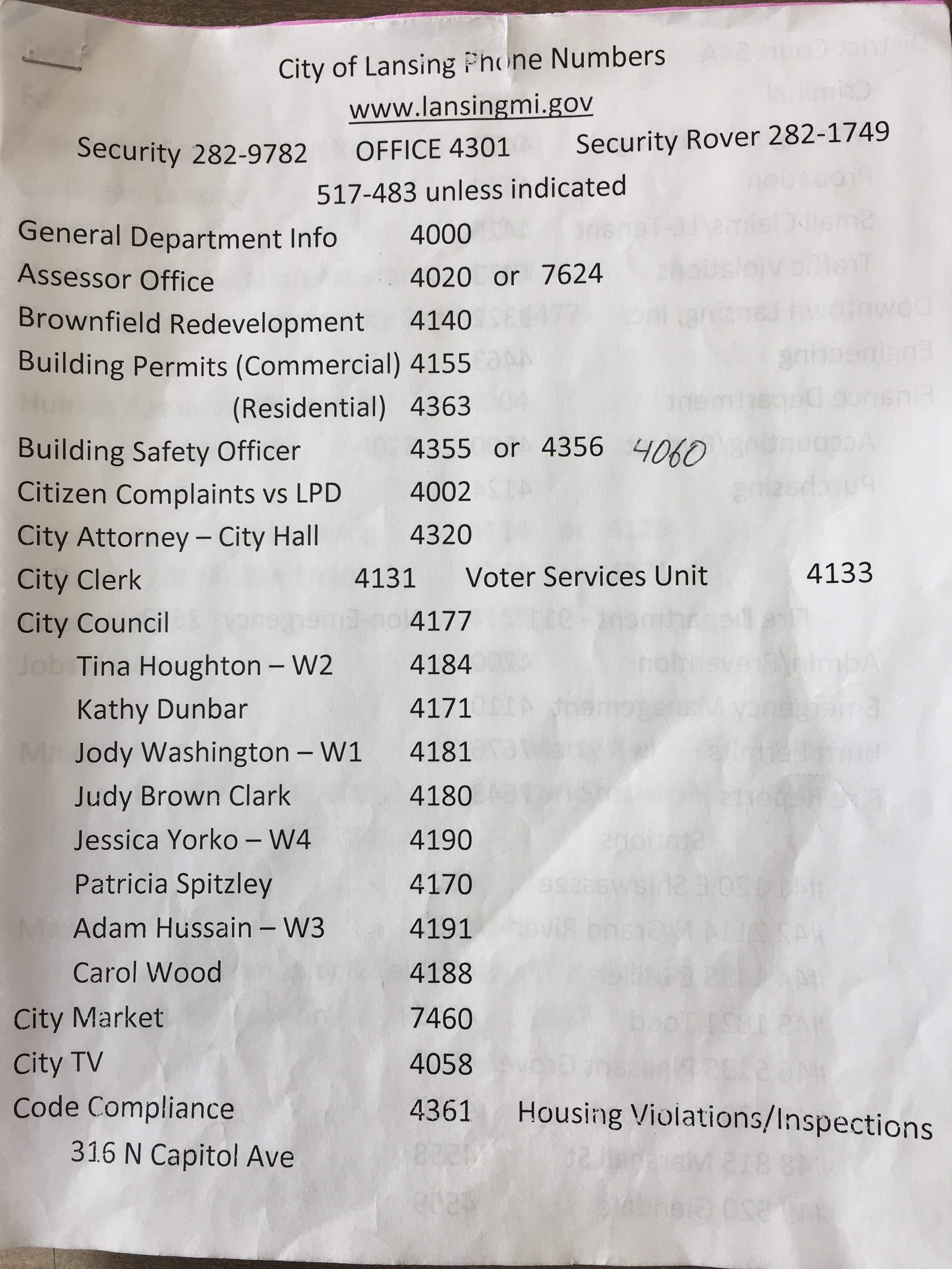 Citizens have complained about being redirected from department to department when they call to register a complaint. This might happen because city workers don’t know where to route calls. Many employees at the city maintain their own list of phone numbers to better serve the people. Some city workers have even mentioned searching for the phone numbers on Google or the Lansing website themselves to redirect the citizens to the right place.