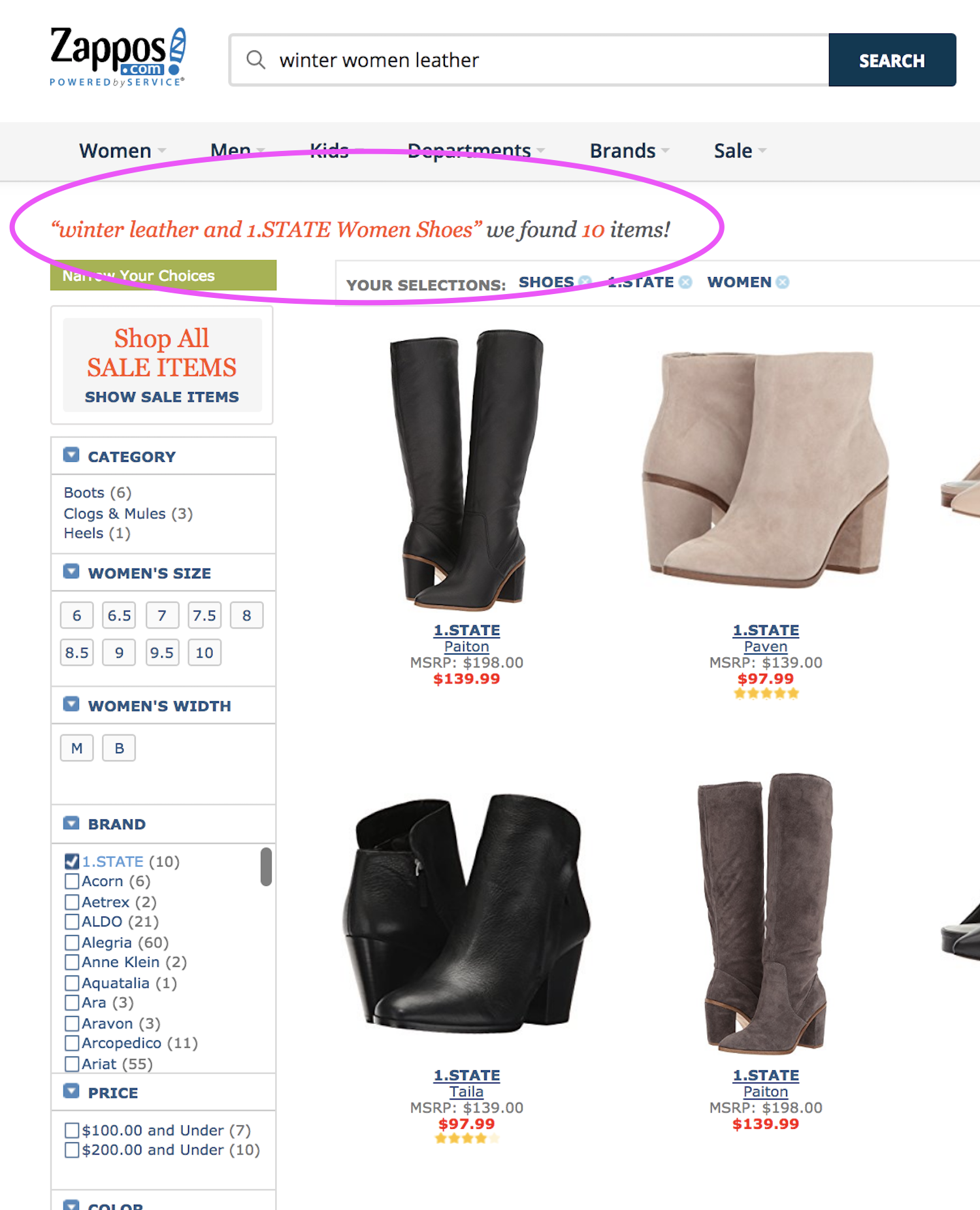 This experience bothered several of our participants. Their mental models said that there should be 2309 results and not 1941. They felt that the addition and subtraction of the filters should mirror the addition and subtraction of the search results. They also didn’t like the idea that they were missing out on the 368 items that had disappears. Zappos should change the filters so that the addition and subtraction of the filters mirrors the addition and subtraction of the search results.