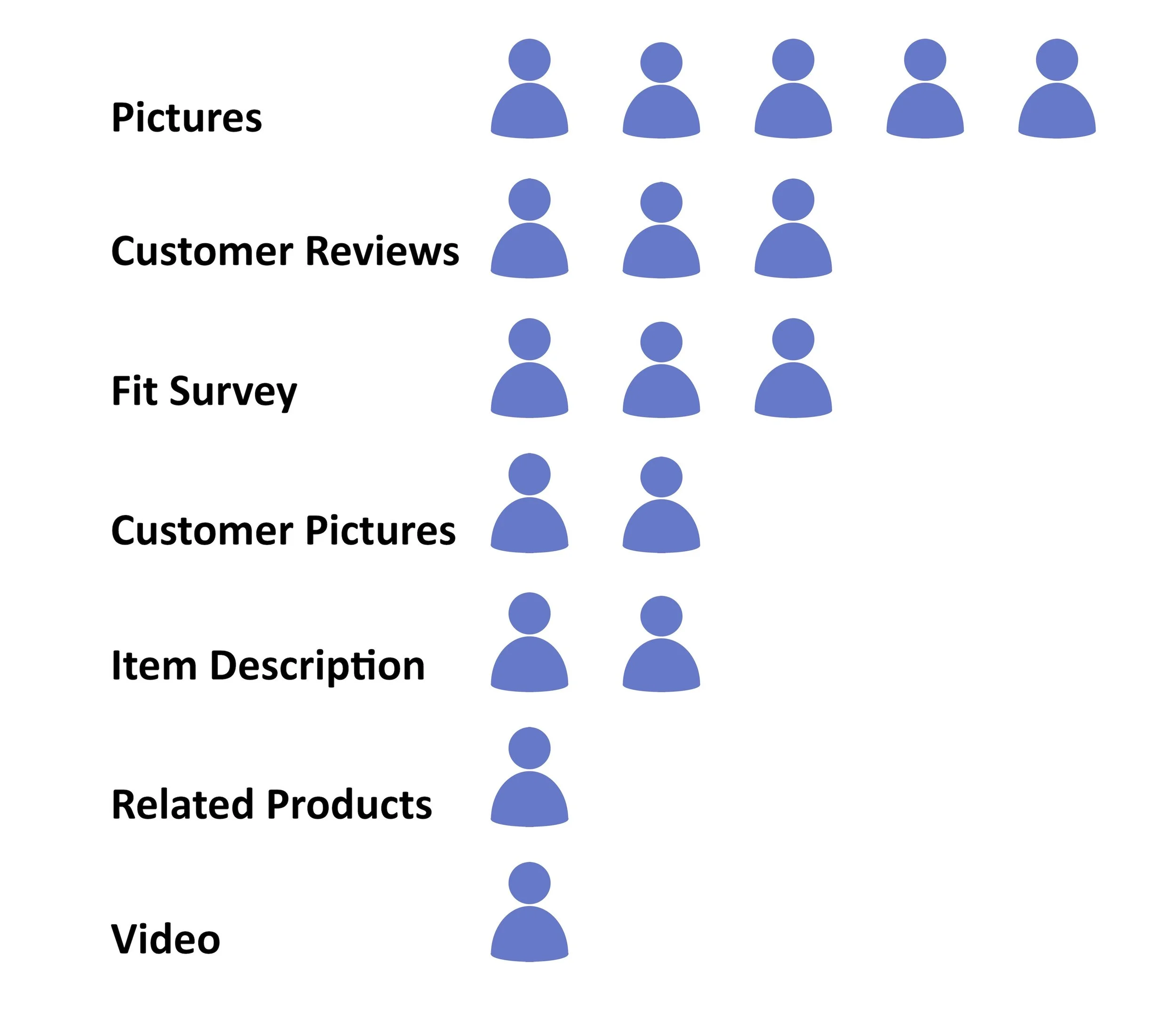 The customer reviews and the fit survey were the used by three out of five participants, therefore this information that was of secondary importance in determining which shoes the participants would add to their carts. Since the reviews and the fit survey are user generated, we see again that the information generated by previous customers is the most important.